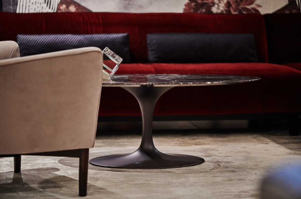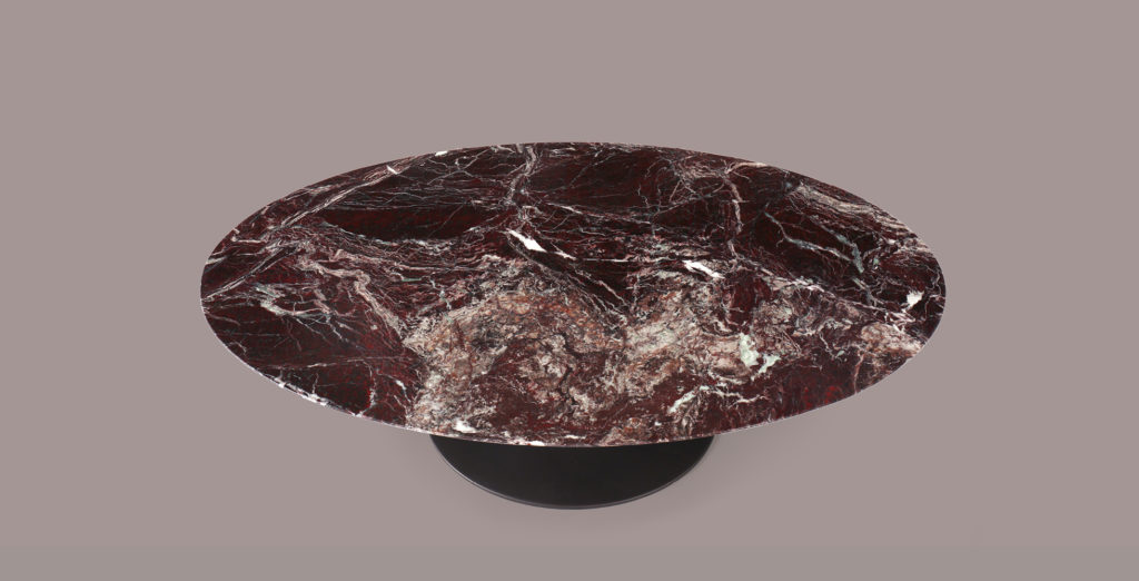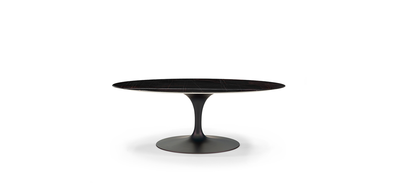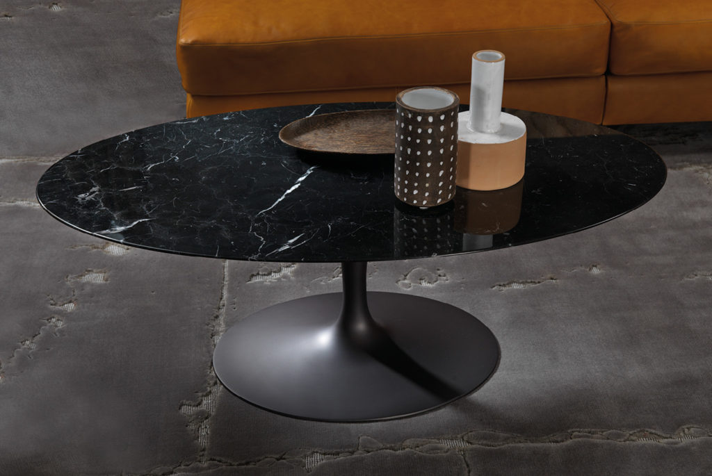 Coffee table with elliptic shaped marble top and cast aluminum base available in several finishes.